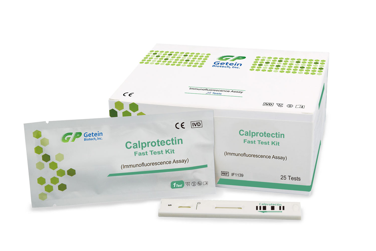 Calprotectin Test Kit based on fluorescence immunoassay technology for quantitative detection of fecal calprotectin in human stool samples. The test is used as an aid in diagnosis and monitoring of inflammatory bowel diseases and is compatible with GETEIN immunofluorescence quantitative analyzers.
