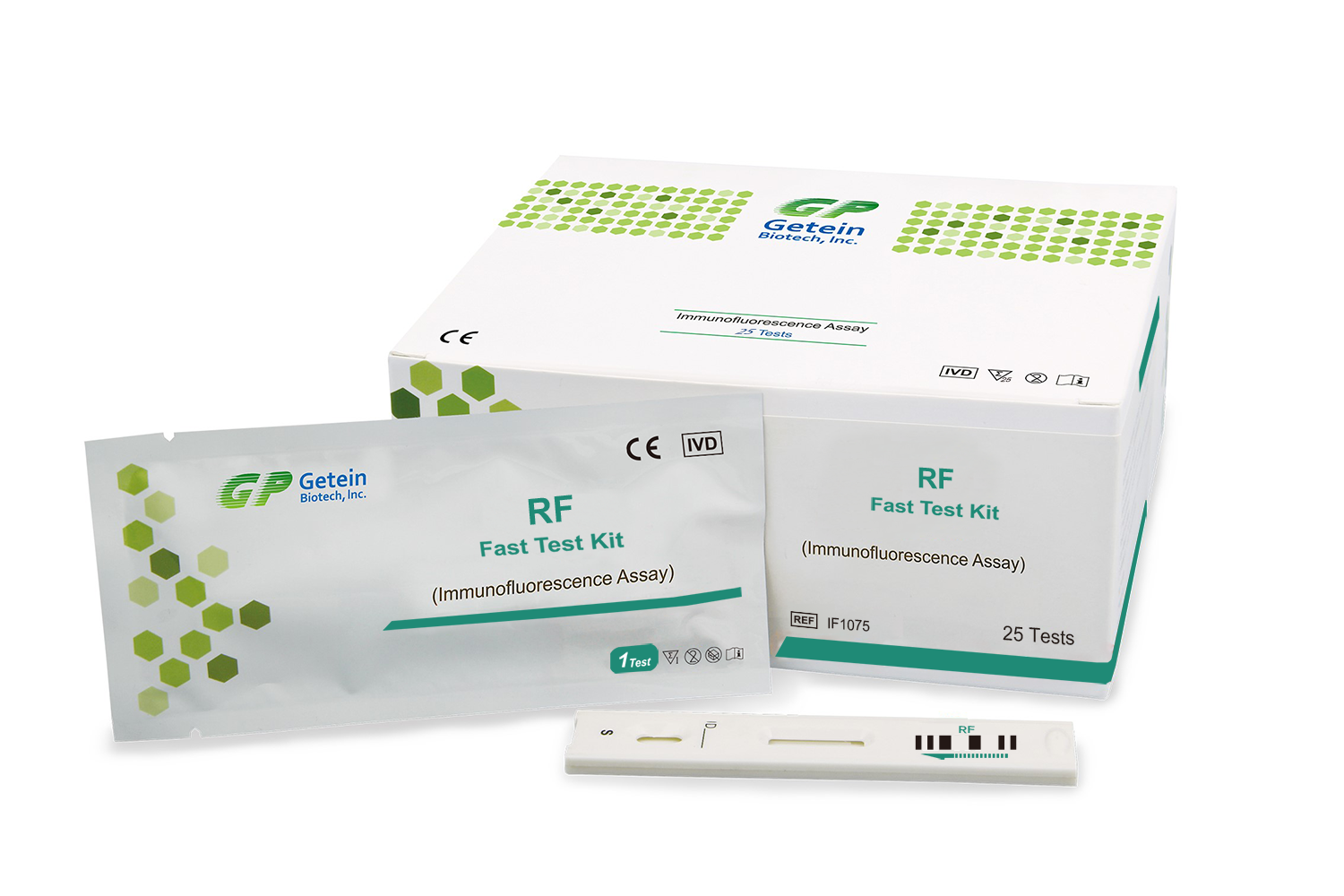 RF Test Kit based on fluorescence immunoassay technology for quantitative detection of Rheumatoid Factor (RF) in human serum, plasma or whole blood samples. The test is used as an aid in diagnosis of rheumatoid arthritis and autoimmune diseases and is compatible with GETEIN immunofluorescence quantitative analyzers.